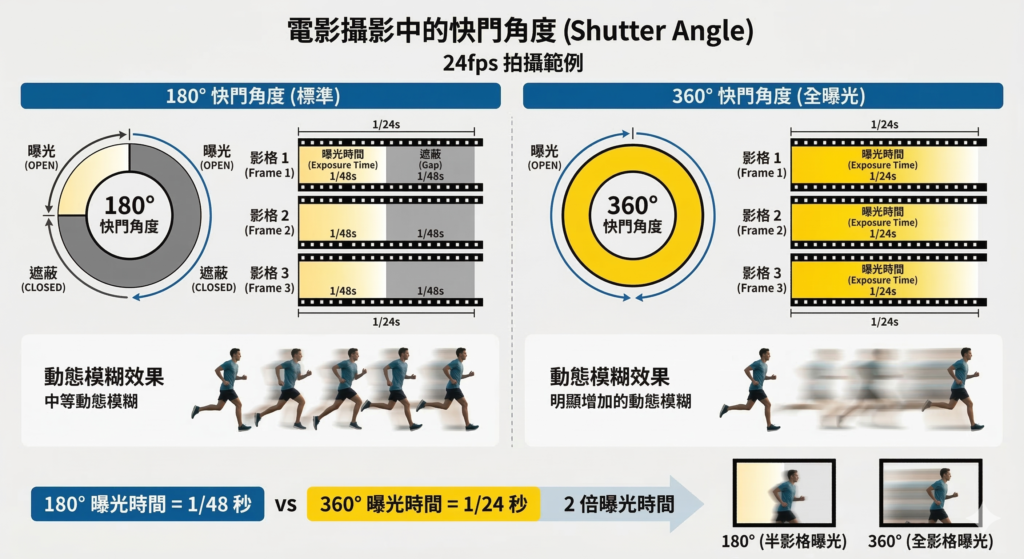 在電影攝影裡,「快門角度(Shutter Angle)」決定每一格畫面曝光多久。當角度是 360° 時,代表整個影格時間都在曝光。